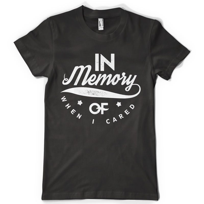 "In memory of when I cared" T-shirt design featuring simple typography style print with distress effect. The files available are suitable for Adobe Illustrator, Adobe Photoshop and Corel Draw and can be used for digital printing and screenprinting.