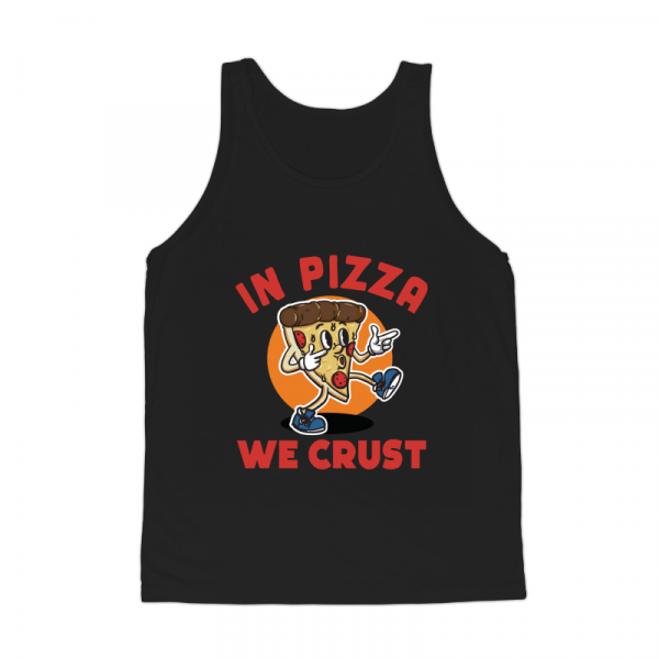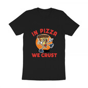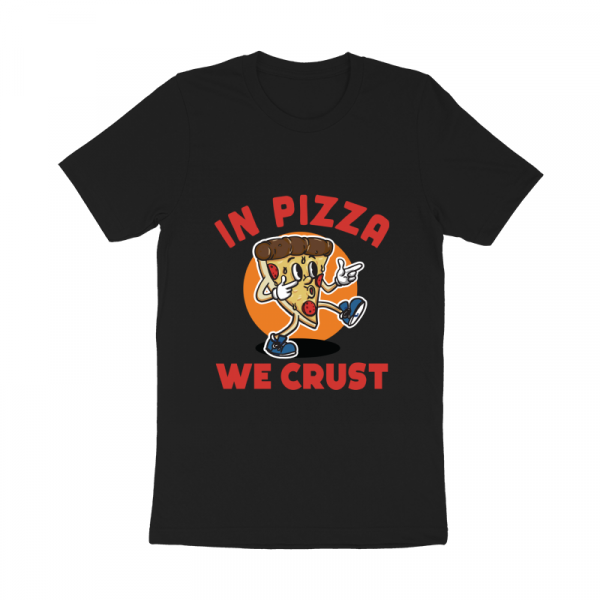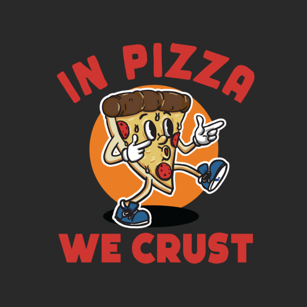 This design “in pizza we crust ” is made in Adobe Ilustrator is ready for print.