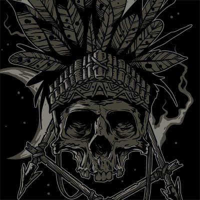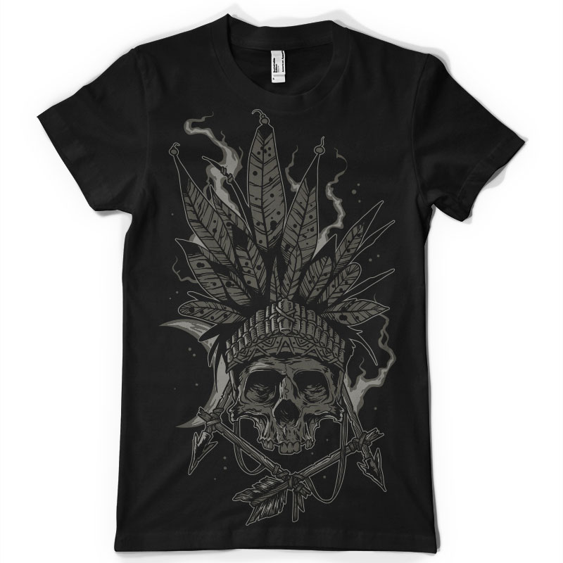 Indian t-shirt design features a hand drawn indian skull with feather headdress. This is an Adobe Illustrator file, ready for print. Files included are Eps. The template can be used for digital printing and screenprinting.The file is well organised with every element on its own layer, including artwork , and background