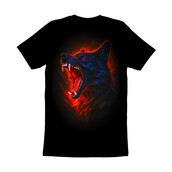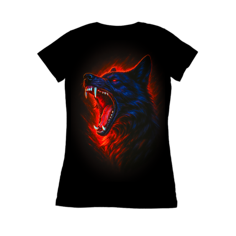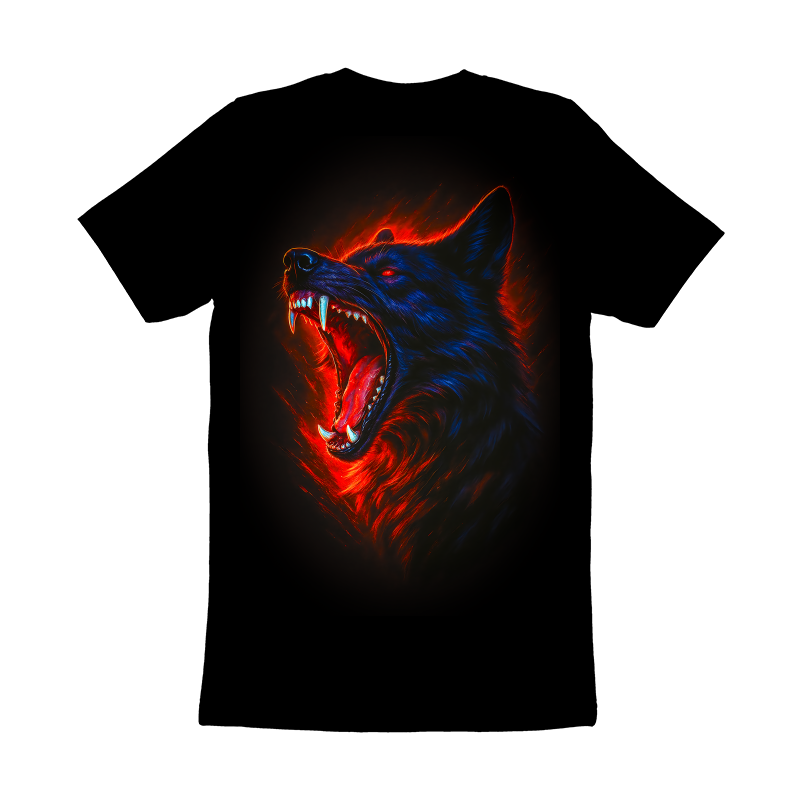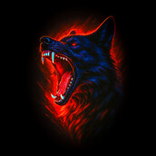 This striking design features a wolf's head rendered in a dramatic, almost hellish style. The wolf is depicted mid-roar, mouth wide open, revealing sharp teeth and a vivid red interior. The fur is a deep blue, contrasted by the fiery red glow emanating from within and around the animal. The eyes burn with an intense red, adding to the ferocious and intimidating nature of the image. The background is black, making the wolf's colors pop intensely. The overall effect is one of power, aggression, and untamed wildness. The design blends elements of realism with a stylized, almost graphic novel aesthetic, making it visually compelling and memorable. Designers could use this for apparel, especially t-shirts and hoodies. It's also suitable for posters, album covers, or branding for products aimed at a bold, edgy audience. The strong imagery would work well in the gaming or music industries, appealing to fans of fantasy, horror, or heavy metal genres. The design could also be adapted for tattoo art.