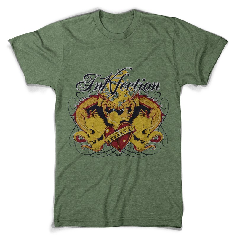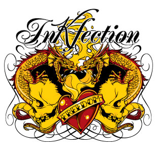 Inkfection freedom design template in vector format, featuring detailed skulls and dragons now available for Adobe Illustrator, Adobe Photoshop and Corel Draw and can be used for digital printing and screenprinting .