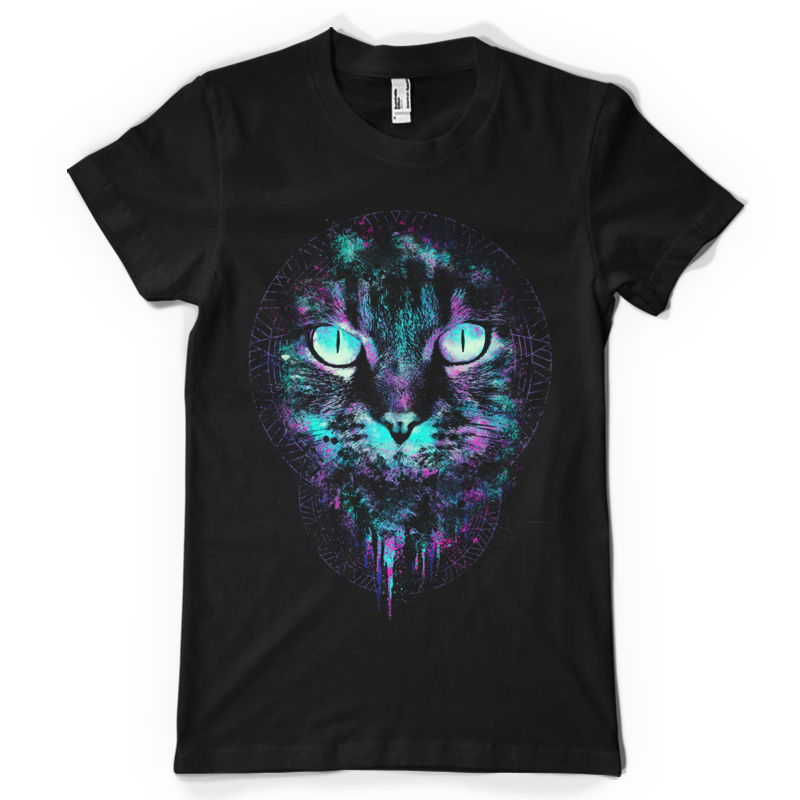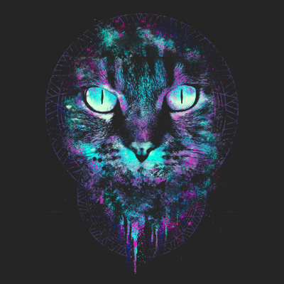 An illustration of a cat with big wide eyes paired with a geometric pattern at the background. Iris is a flat, colored, ring-shaped membrane behind the cornea of the eye, with an adjustable circular opening (pupil) in the center.