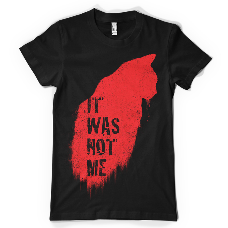 Unique digital illustration of a silhouette Cat looking mad and strong while incorporating it with a humor quote for cats "“It was not me”. Design is very unqie in terms of digital elements and grunge textures. File contains a PSD with layers and a size of 17" x 24" with 300 dpi.