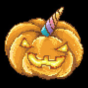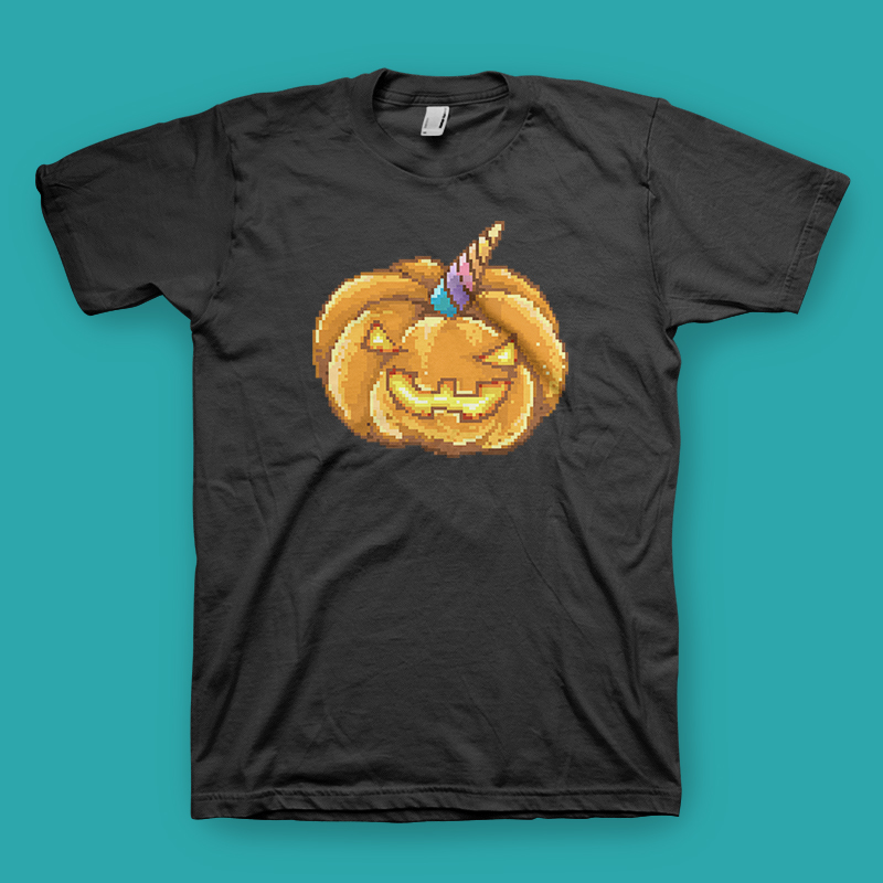 Jack O Lantern Unicorn. This design inspired from the classic horror / zombie game tittle with pixel art style artwork, halloween theme and unicorn horned.