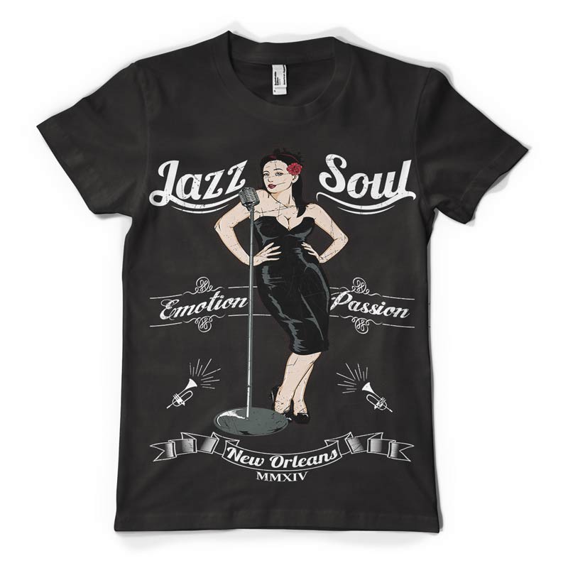 Jazz t-shirt design features a detailed screen print of beautiful singer now available for Adobe Illustrator, Adobe Photoshop and Corel Draw and can be used for digital printing and screenprinting .