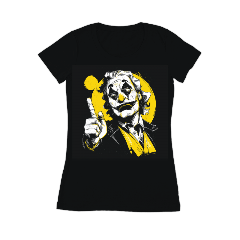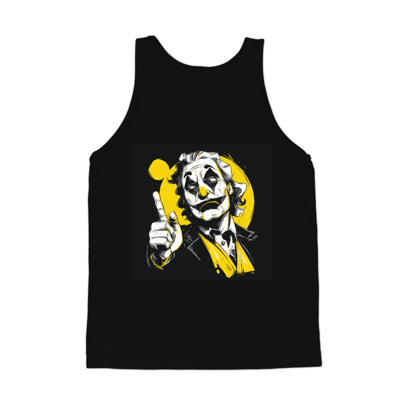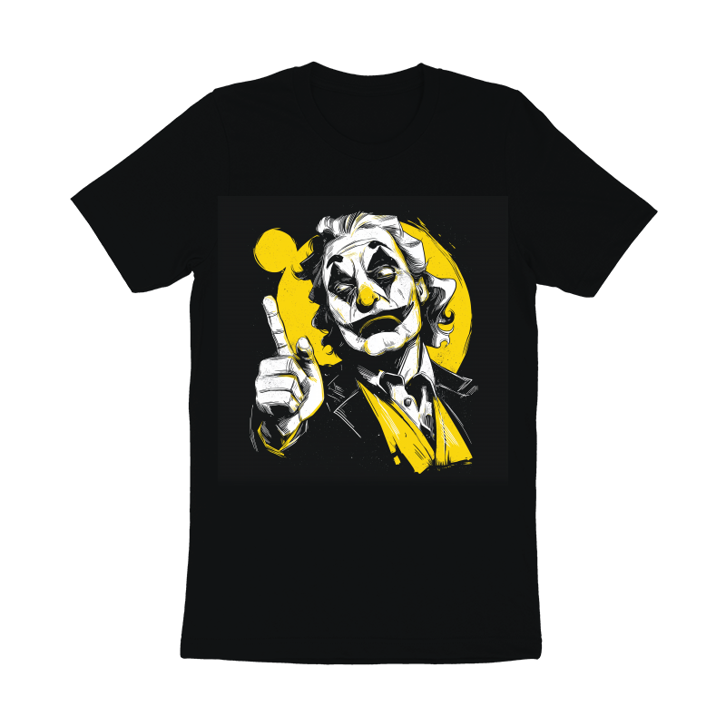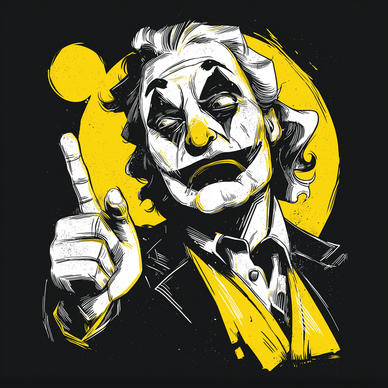 This striking illustration features the Joker in a unique black, white, and yellow color scheme. The design captures the essence of the character with his signature makeup and unsettling gaze. The artist uses bold lines and shading to create a dynamic and visually appealing image. The Joker is depicted pointing upwards, adding a sense of drama and intrigue. The yellow background provides a vibrant contrast to the monochrome elements, making the character stand out. The overall style blends elements of comic book art with a modern, graphic design aesthetic. This artwork is perfect for fans of the Joker and comic book enthusiasts alike.