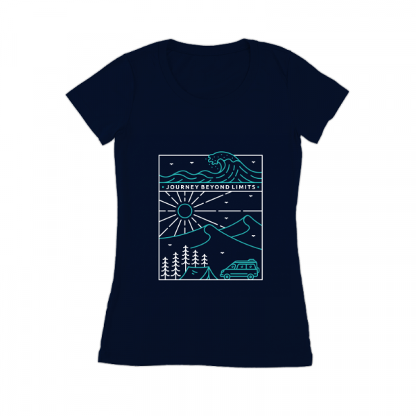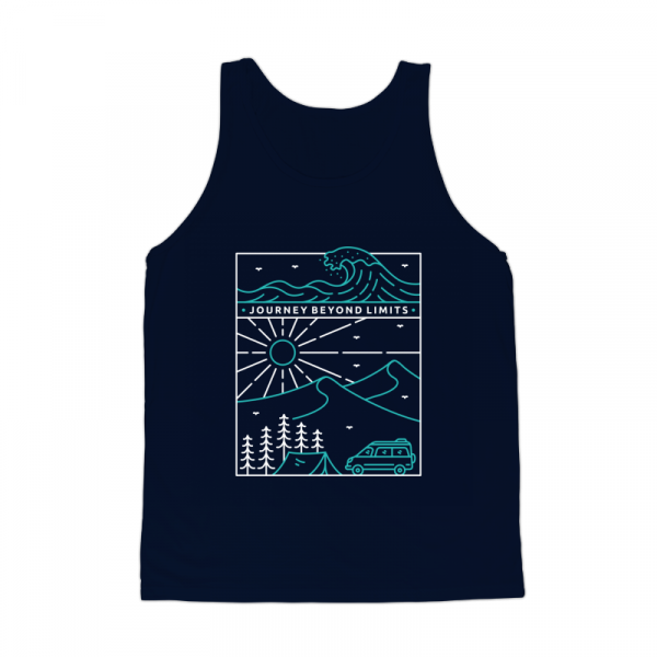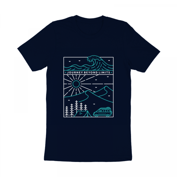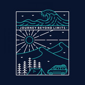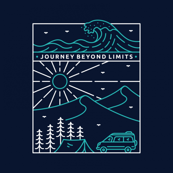 Journey Beyond Limits 1 is a monoline illustration that is suitable for apparel or merchandise about summer, vacation, holiday, beach, ocean, surfing, van, camper van, camping, nature, outdoor, mountain, national park, adventure, travel.