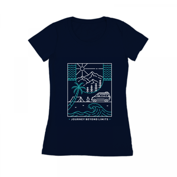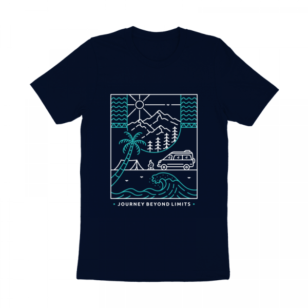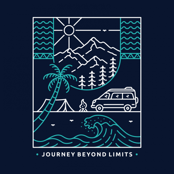 Journey Beyond Limits 2 is a monoline illustration that is suitable for apparel or merchandise about summer, vacation, holiday, beach, ocean, surfing, van, camper van, camping, nature, outdoor, mountain, national park, adventure, travel.