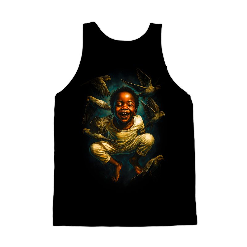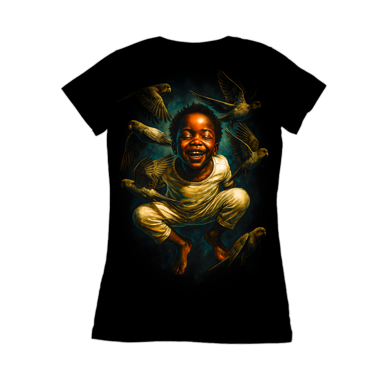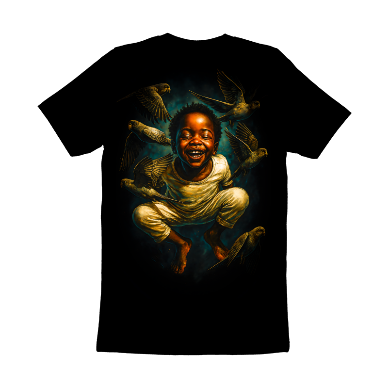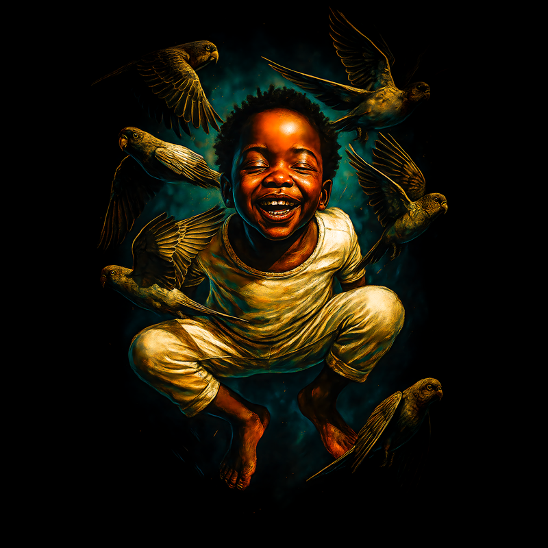 This artwork captures a moment of pure, unadulterated joy. A young boy, eyes closed and a wide, beaming smile on his face, is surrounded by a flock of birds. The lighting is dramatic, with strong contrasts that highlight the boy's features and the birds' plumage. The composition is dynamic, with the birds in various stages of flight, creating a sense of movement and energy. The color palette is rich and warm, dominated by golden hues that give the scene a dreamlike quality. The background is dark and atmospheric, providing a stark contrast that makes the boy and birds stand out. The overall effect is one of happiness, freedom, and connection with nature.
