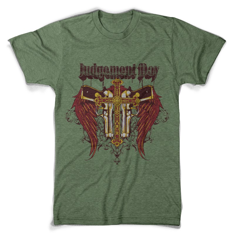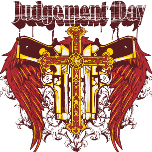 Judgement day digital design template in vector format, featuring detailed winged cross and guns now available for Adobe Illustrator, Adobe Photoshop and Corel Draw and can be used for digital printing and screenprinting .