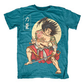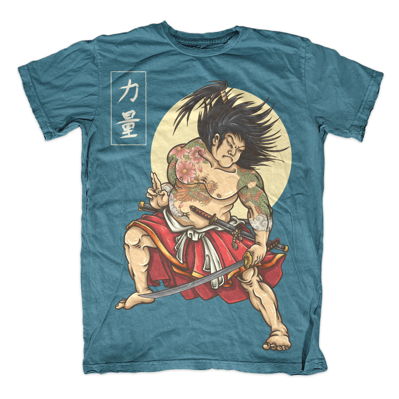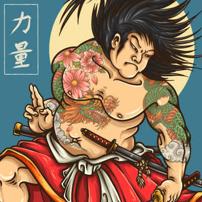 Vector illustration of japanese kabuki samurai hero tattoo style drawing, the japanese kanji words means strength. Ready to print on t-shirt.