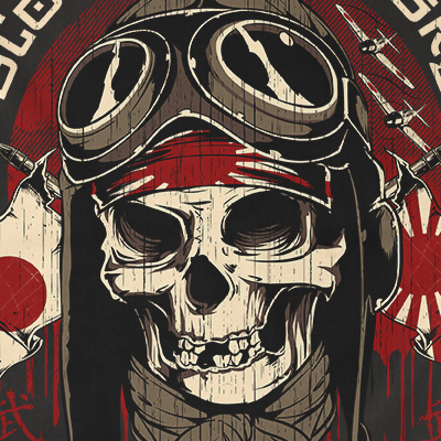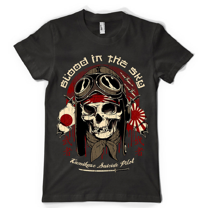 Kamikaze t-shirt design features a Suicide Skull Pilot detailed screen print now available for Adobe Illustrator, Adobe Photoshop and Corel Draw and can be used for digital printing and screenprinting