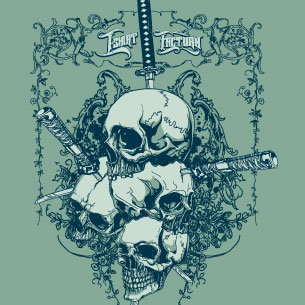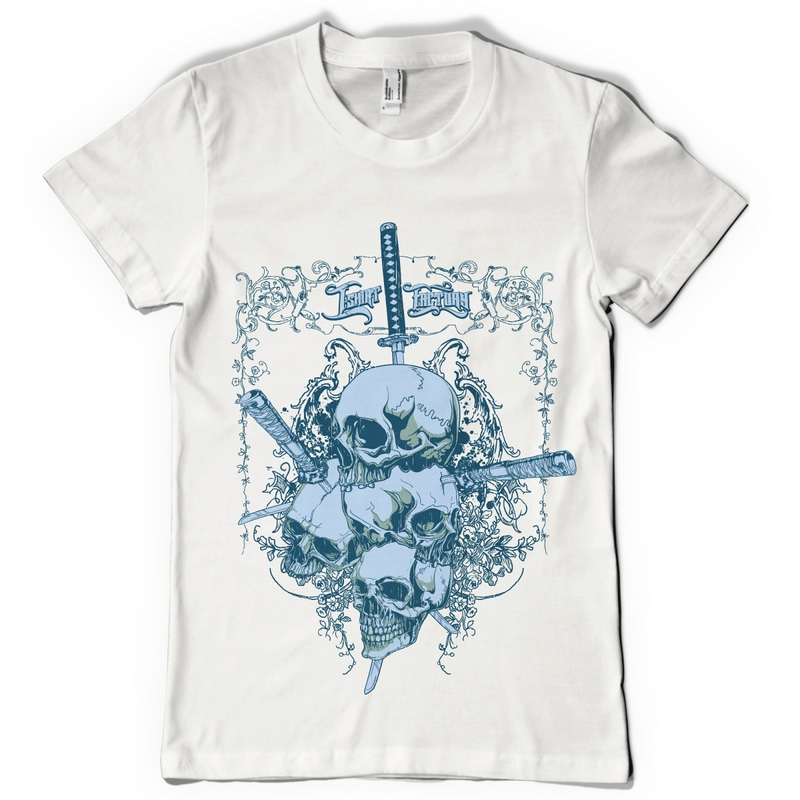 Katanas T-shirt design in vector format, featuring detailed multiple skull and katanas now available for Adobe Illustrator, Adobe Photoshop and Corel Draw and can be used for digital printing and screenprinting .