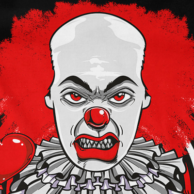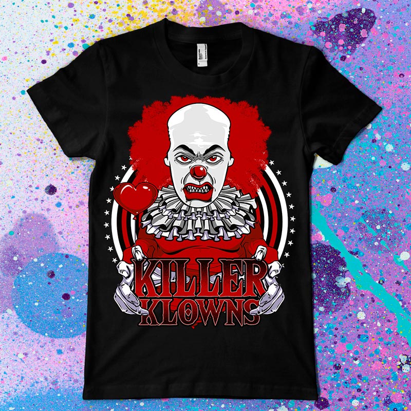 Killer Klowns t-shirt design features a terror clown design detailed screen print now available for Adobe Illustrator, Adobe Photoshop and can be used for digital printing and screenprinting.
