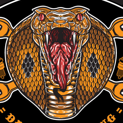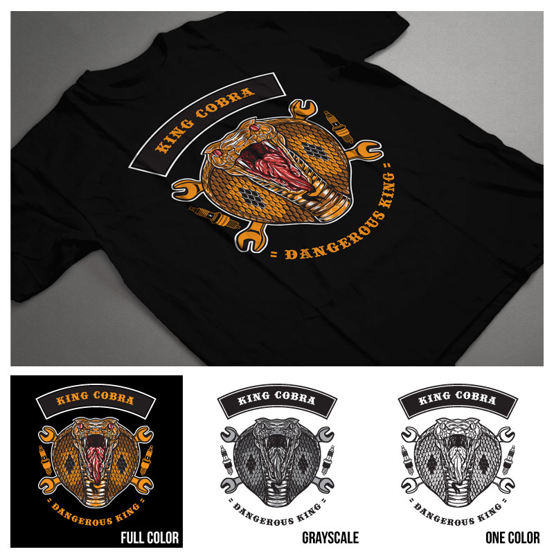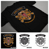King Cobra T shirt Illustration "Biker Patches Animals Series" An illustration of an angry Lion head with, motorcycle chain, and some ornaments. Suitable for your biker community, clothing line store, or event. Easy to replace the text and colors. ZIP Feautures 3 Folder Full Colors version, Gray Colors Version and 1 Color version Each folder contain 1 EPS 10 1 Ai 1 PSD Size 16'x24' CMYK Color mode Layered Editable text