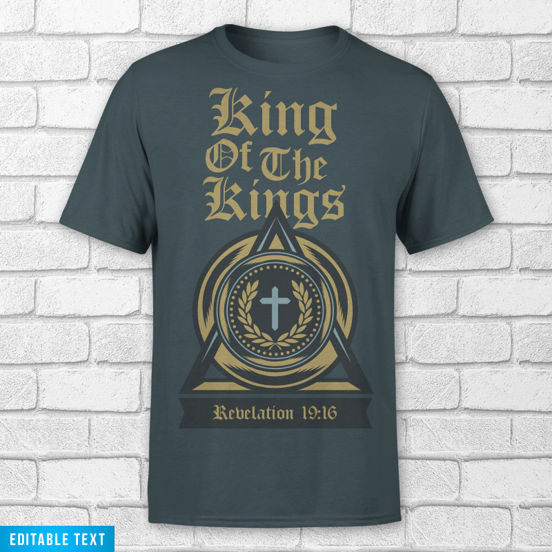 King Of The Kings, Christian t-shirt is typography based graphic combined with geometrical objects, this design made with christian spiritual religious quote and motivational words mixed with vintage style illustration. The text is EDITABLE so you can change with your own words.