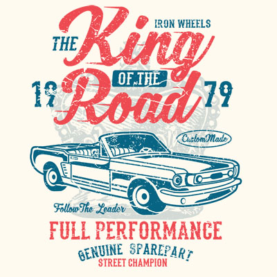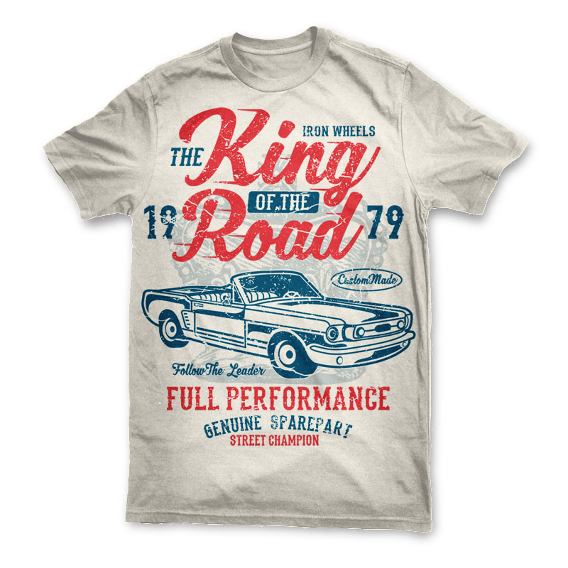 King Of The Road Tshirt Design Template based on vector files , such as AI and CDR also with PSD separated Layers file, the design has 3 color print, it can be used for digital printing and screen printing.