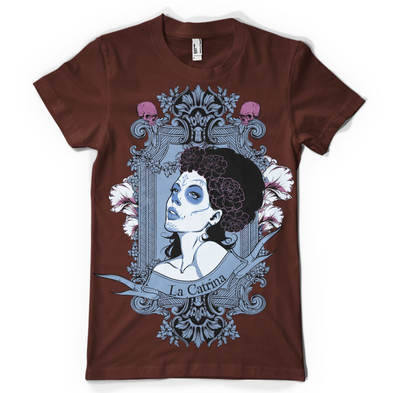 La Catrina t-shirt design. Digital illustration featuring detailed woman, sorrounded by rose petals, La Catrina character of Dia de los muertos mexican tradition. The source file is available in EPS format and can be accessed with the Illustrator software.