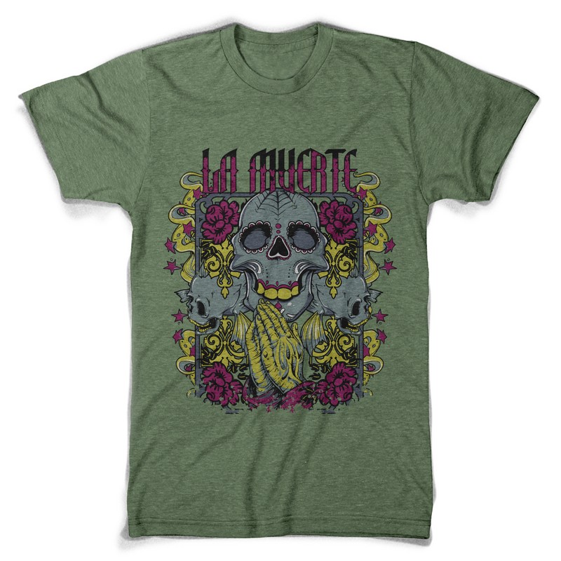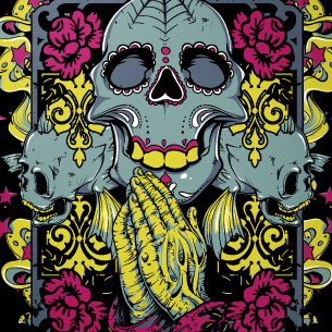 La muerte prayer design template in vector format, featuring detailed framed skull prayer now available for Adobe Illustrator, Adobe Photoshop and Corel Draw and can be used for digital printing and screenprinting .