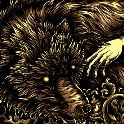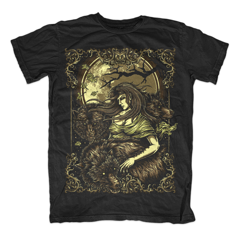 Illustration of queen in the forest with wolves and moon background. Ready to print on t-shirt.