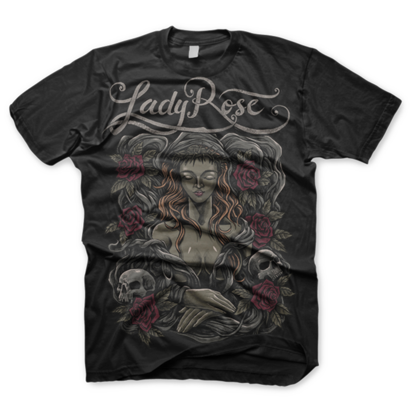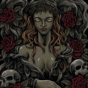 Illustration collage a lady and rose with some skulls on arround. with some nature color...Made with hand drawing looking and tattoo style. Ready to print on t-shirt.