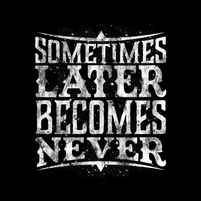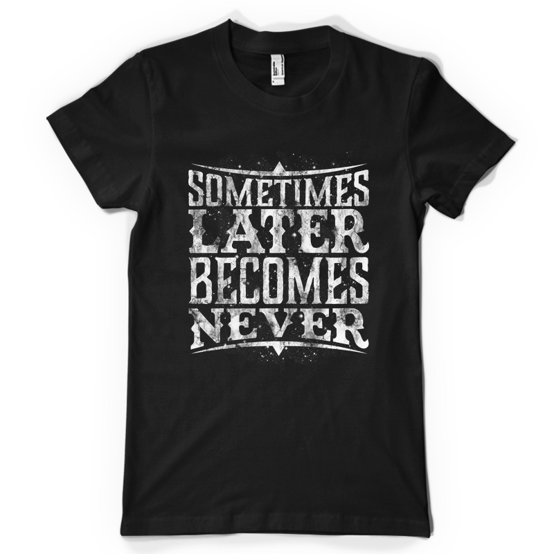 "Later Becomes Never" is a unique customized typography paired with a grunge and textures to make this design stand out. This design uses only 1 color which is easy to print. FIle contains a PSD file with 17x24 in size.