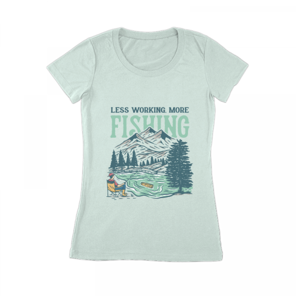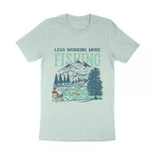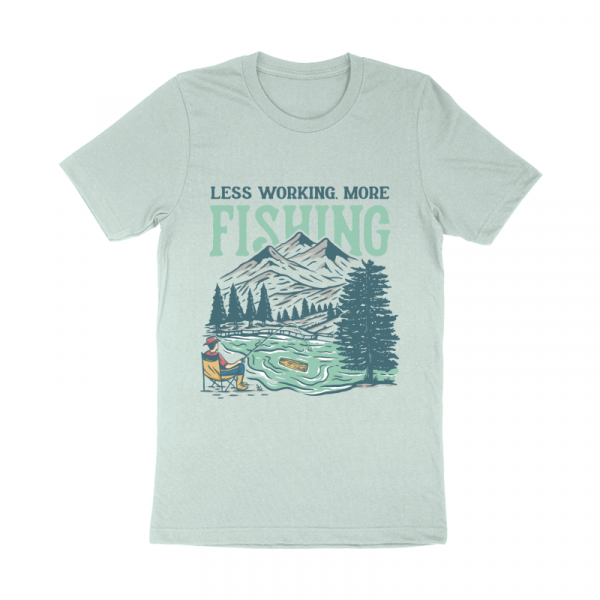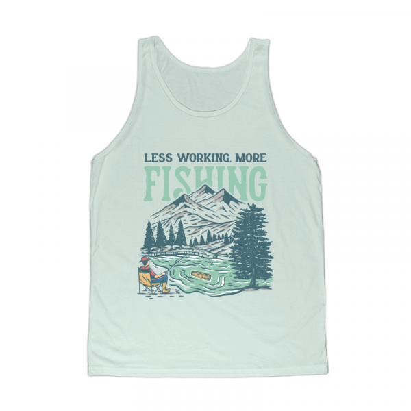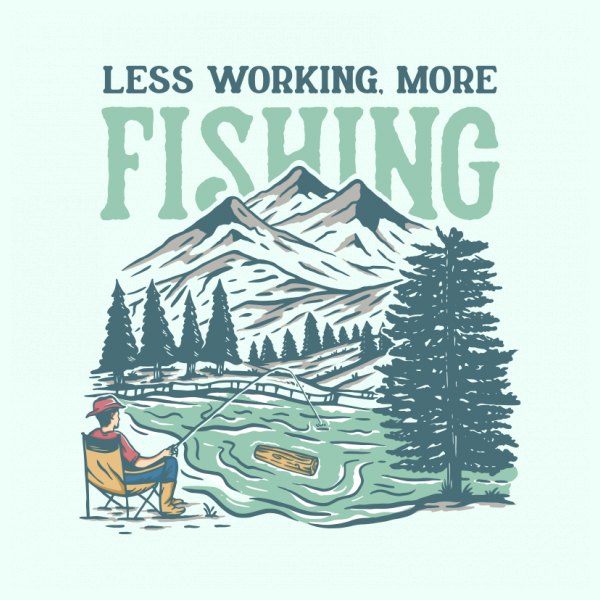 Less Working, More Fishing is a vintage illustration that is suitable for t-shirts, jackets, or merchandise with the theme of fish, fishing, nature, outdoors, animal, wildlife, adventure, travel, mountain, fisherman, wildlife, vacation, river, hunting, wyoming.