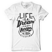 "Life is a dream" T-shirt design featuring typography style quote, with distressed details. The files available are suitable for Adobe Illustrator and Adobe Photoshop and can be used for digital printing and screenprinting.