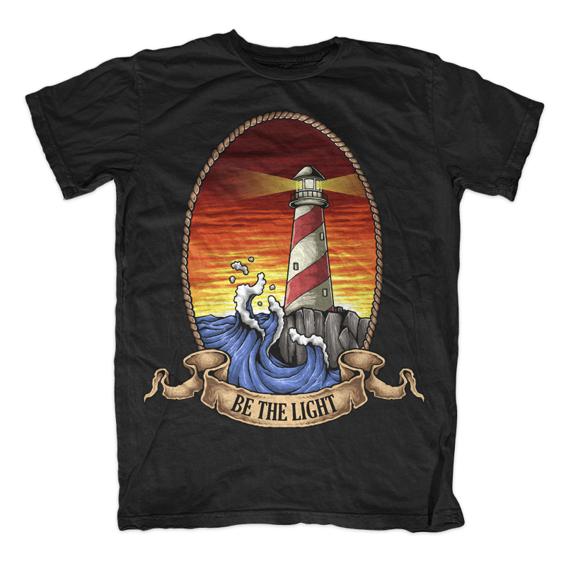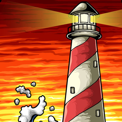 Vector illustration of lighthouse with sunset background. Ready to print on t-shirt.