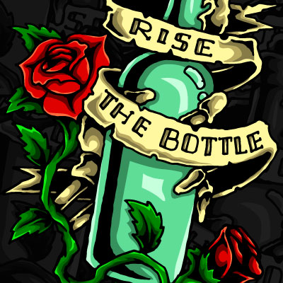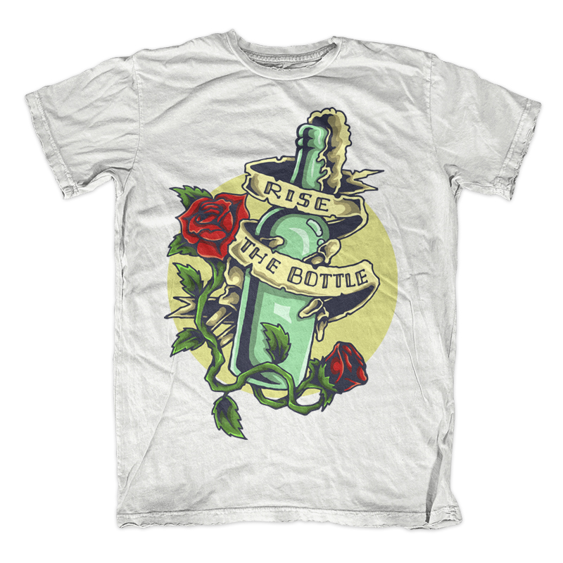 Illustration of liquor bottle tattoo with floral background and banner to put text. Ready to print on t-shirt.