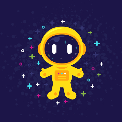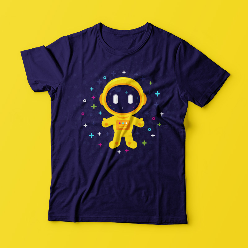 Cute and funny little astronaut with his yellow suit and pixel eyes in space