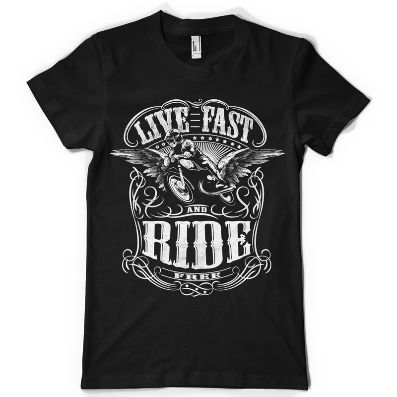 Live fast and Ride free digital design template in vector format, featuring detailed angel rider now available for Adobe Illustrator, Adobe Photoshop and Corel Draw and can be used for digital printing and screenprinting .