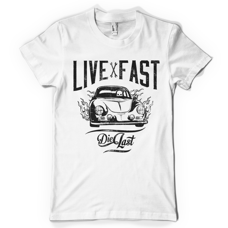 "Live Fast Die Last" T-shirt design featuring typography style quote, with distressed details. The files available are suitable for Adobe Illustrator, Adobe Photoshop and Corel Draw and can be used for digital printing and screenprinting.