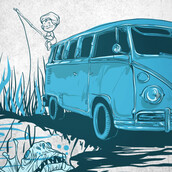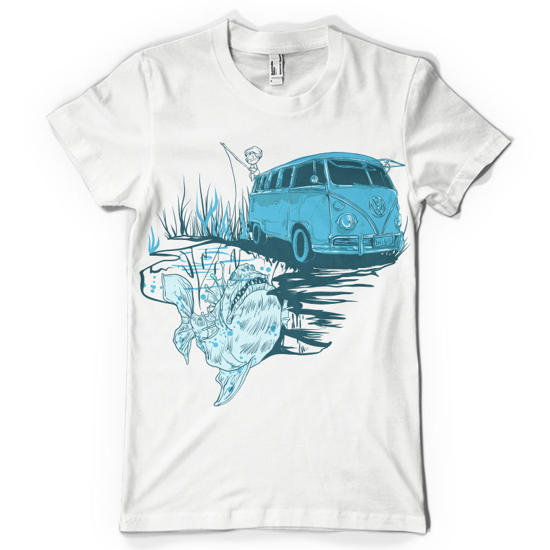 Go fishing t-shirt design. Digital illustration featuring a little boy character who fishes, sorrounded by a vintage car, in the middle of the swamp. The source file is available in EPS format and can be accessed with the Illustrator software.