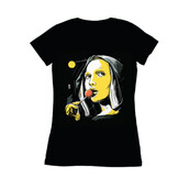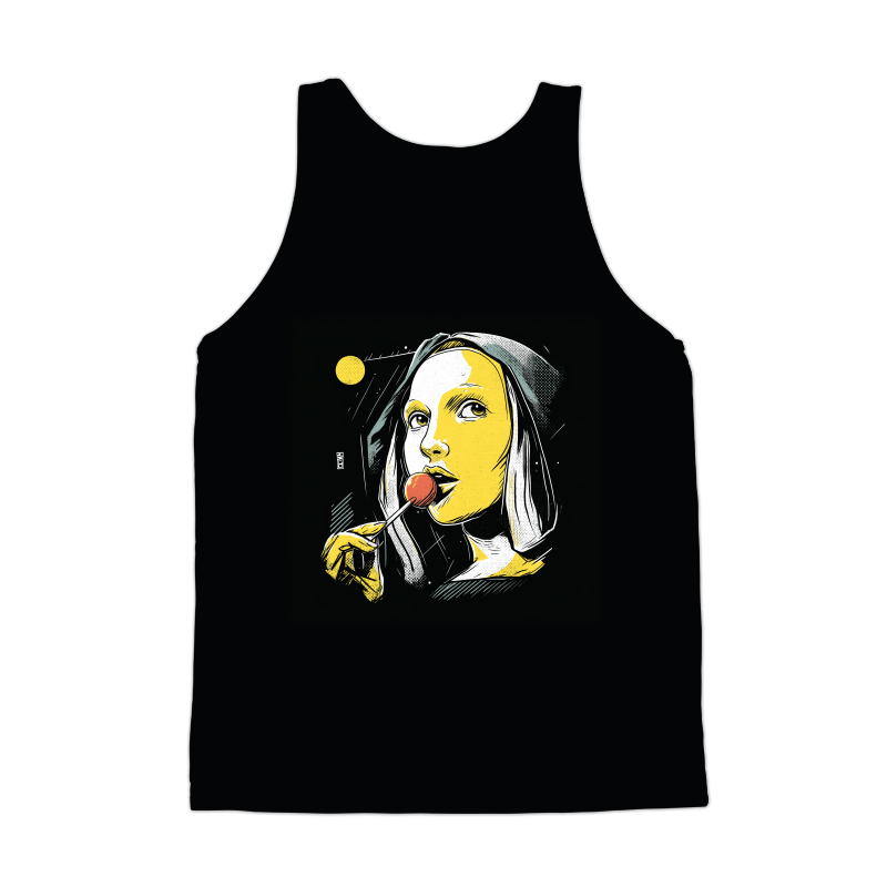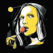 This captivating vector art piece features a stylized portrait of a woman with a lollipop. The design employs a striking contrast of yellow and white against a black background, creating a visually arresting image. The woman's gaze is direct and engaging, drawing the viewer in. Halftone textures add depth and a vintage feel, while bold lines define the contours of her face and clothing. The overall style is reminiscent of comic book art and urban street art, blending elements of both. The composition includes geometric shapes in the background, adding a modern touch to the design. The lollipop serves as a focal point, adding a playful and slightly provocative element to the portrait. The design is clean, well-executed, and suitable for a variety of applications.