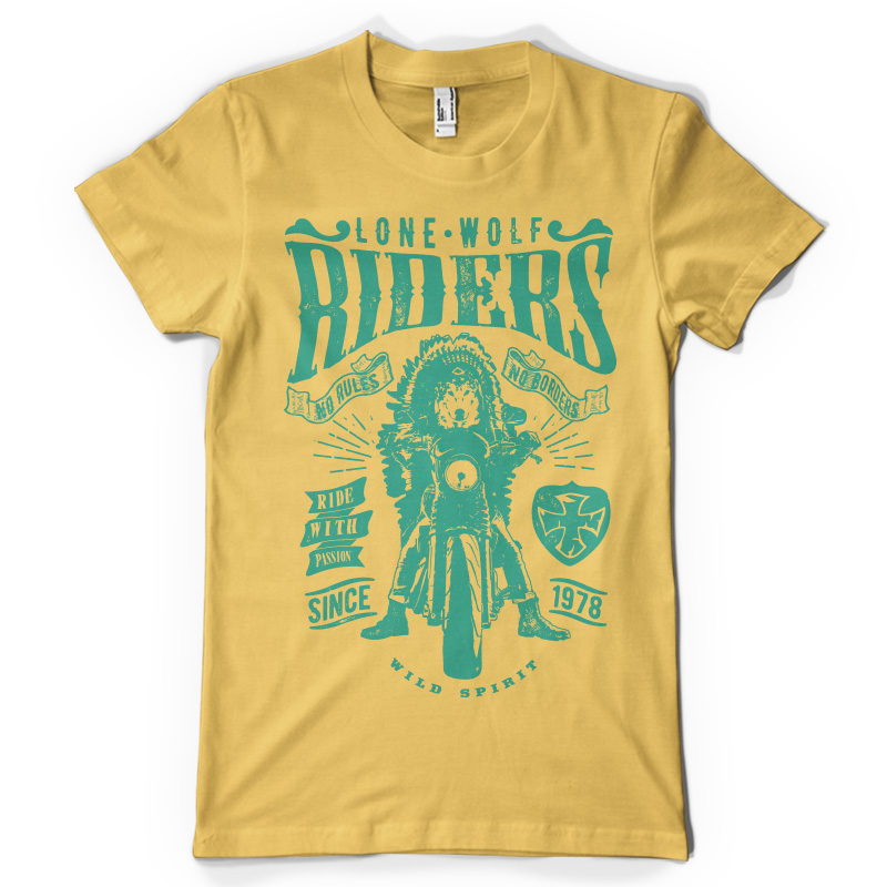"Lone Wolf" T-shirt design featuring bike and typography. The files available are suitable for Adobe Illustrator, Adobe Photoshop and Corel Draw and can be used for digital printing and screenprinting.