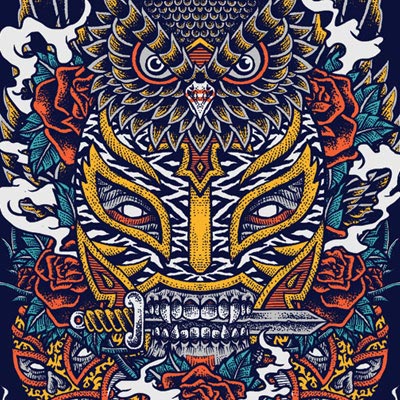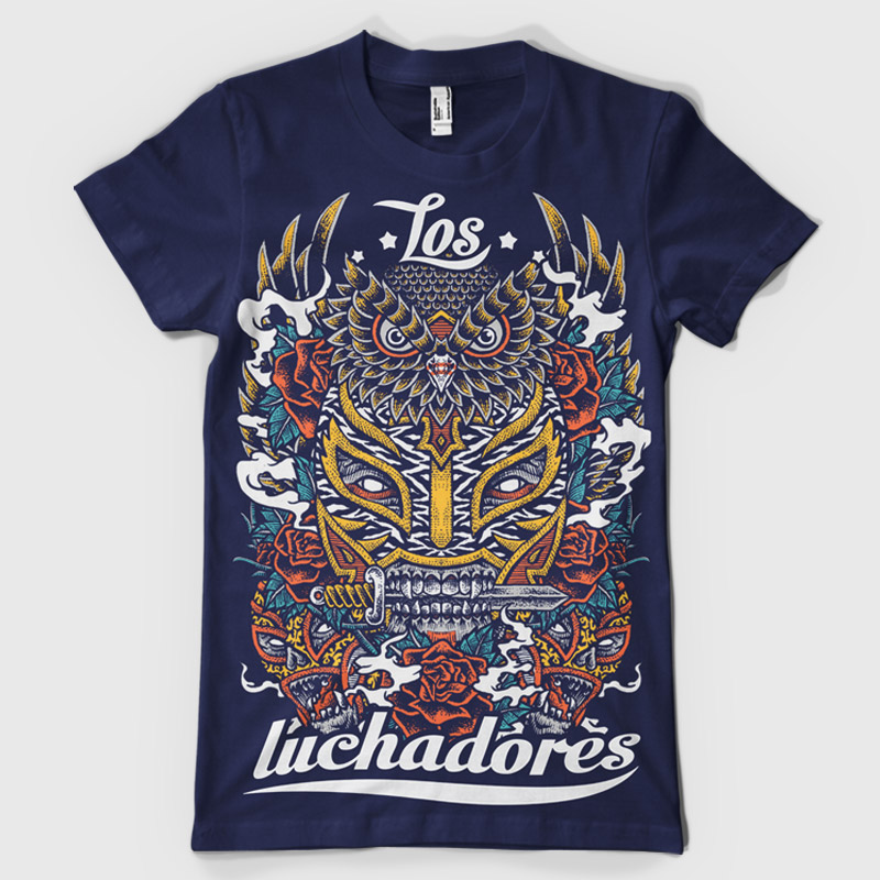 Los Luchadores t-shirt designs, featuring a detailed owl head, a fighter mask, sorrounded by roses and other elements. The source file is available in psd format and can be accessed with the Photoshop software.