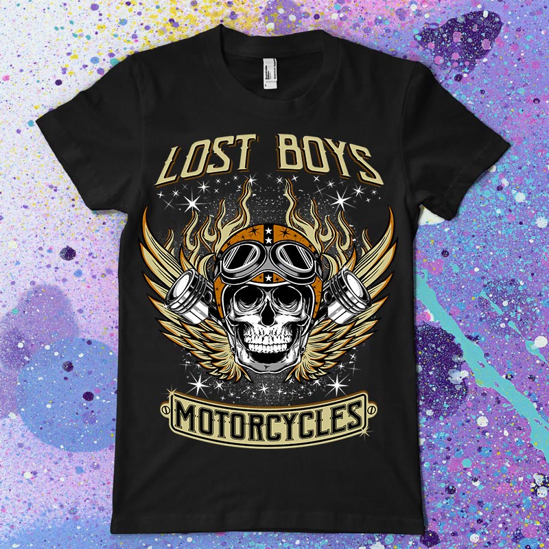 Lost Boys t-shirt design features a skull motor design detailed screen print now available for Adobe Illustrator, Adobe Photoshop and can be used for digital printing and screenprinting.
