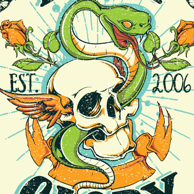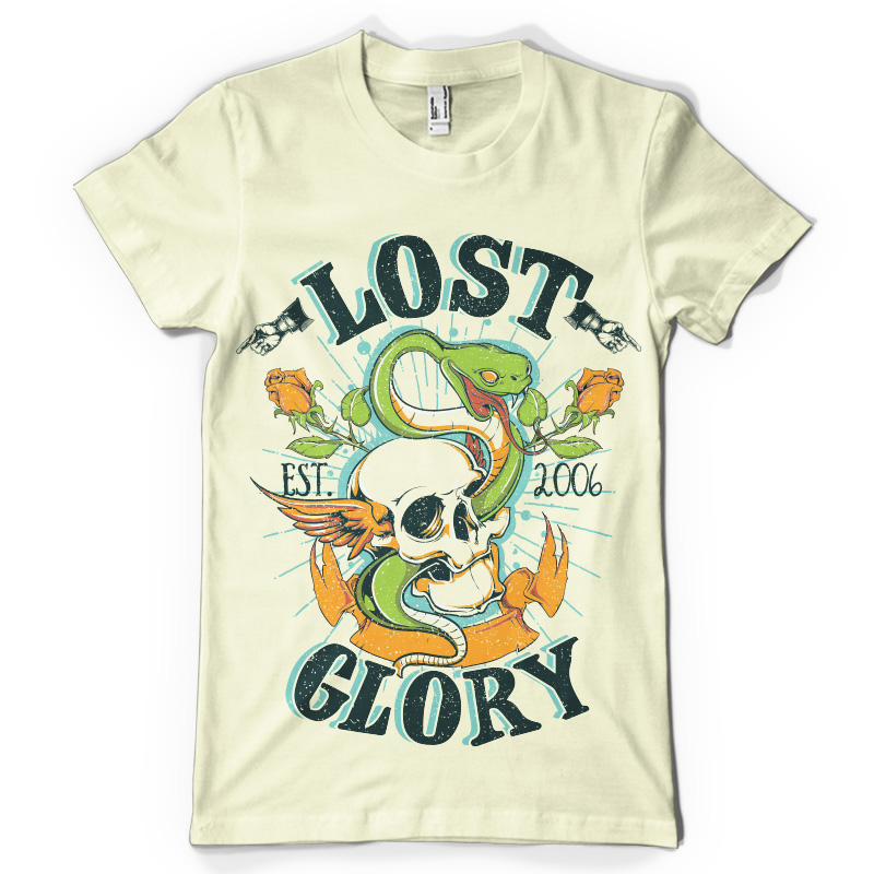 Lost Glory T-shirt Design featuring a snake coming out of a skull's eye. Design available in vector format and can be used for digital printing and screenprinting. The file will be available for Adobe Illustrator, Adobe Photoshop.