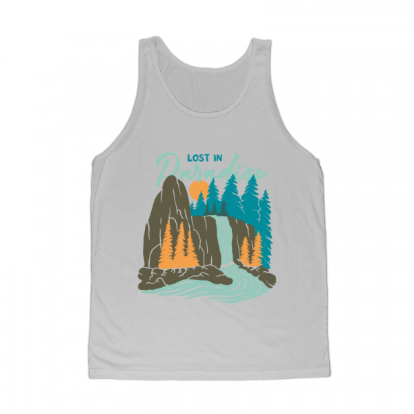 Lost in Paradise is a vintage illustration that is suitable for apparel or merchandise about nature, outdoors, adventure, mountain, paradise, falls, national park, summer, tropical, vacation, holiday, waterfall.