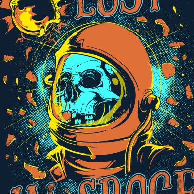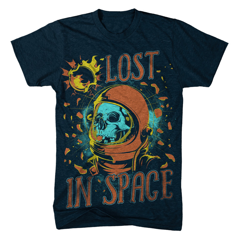 Lost in space t-shirt design featuring a skull with a space helmet.The template can be used for digital printing and screenprinting. The file will be available for Adobe Photoshop, Adobe Illustrator and in PDF format.