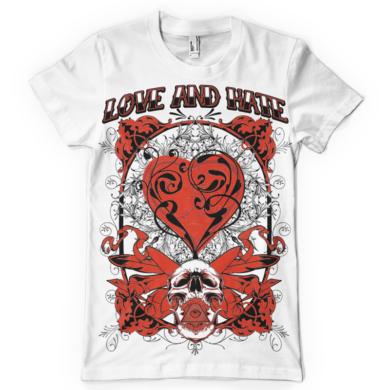 Love and hate printed t-shirt features a detailed screen print of skull romance now available for Adobe Illustrator, Adobe Photoshop and Corel Draw and can be used for digital printing and screenprinting . Ready to print or use in anything you want.
