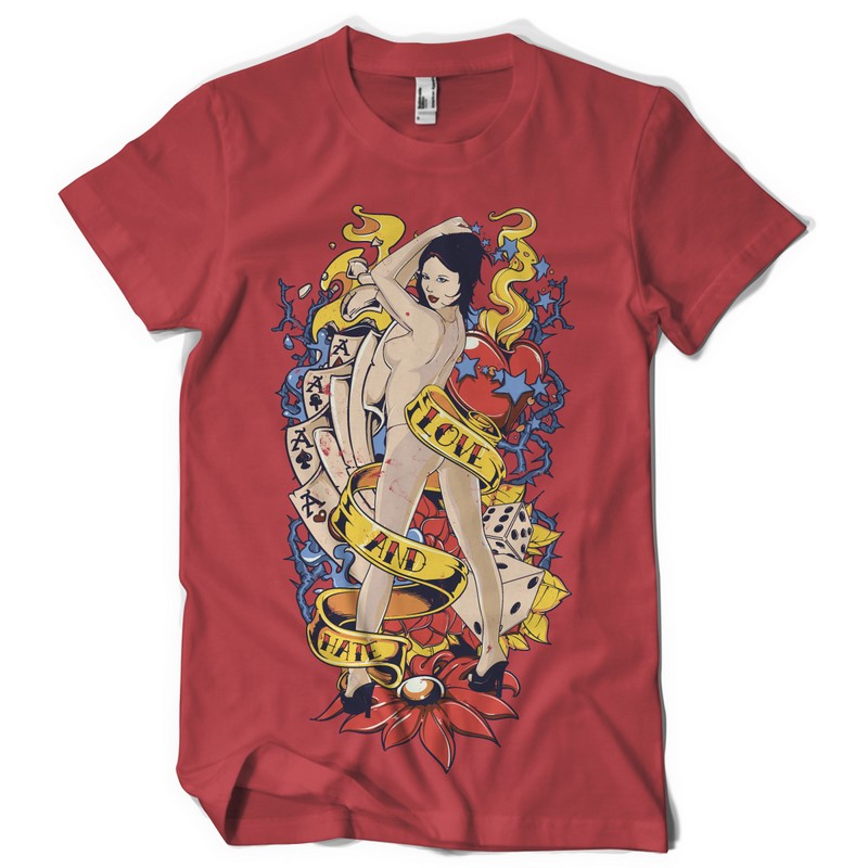 Love and hate digital design template in vector format, featuring detailed sexy girl and cards now available for Adobe Illustrator, Adobe Photoshop and Corel Draw and can be used for digital printing and screenprinting .