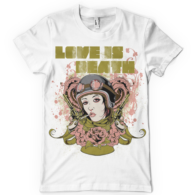 Love is death printed t-shirt features a detailed screen print of sexy pilot girl smoking is now available in EPS format file and can be used for digital printing and screenprinting . Ready to print or use in anything you want.