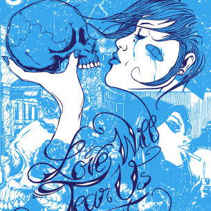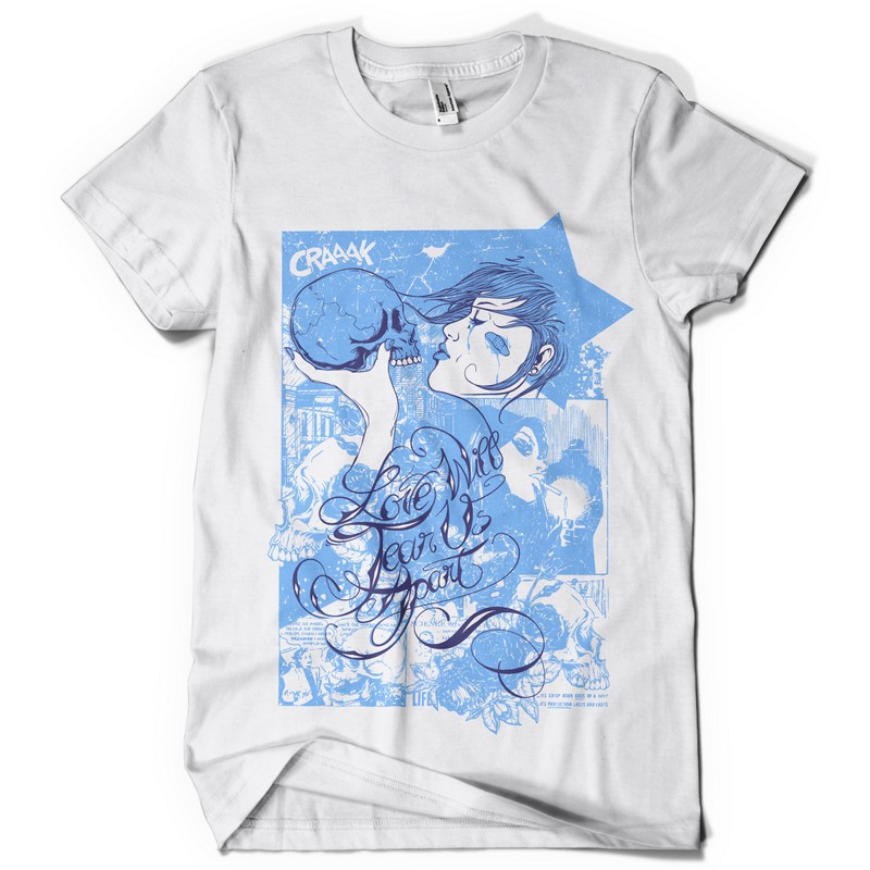 Love will year us apart graphic design template in vector format, featuring detailed kiss between a girl and a skull now available for Adobe Illustrator, Adobe Photoshop and Corel Draw and can be used for digital printing and screenprinting .