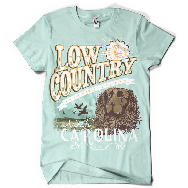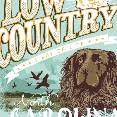 "Low Country" T-shirt design featuring detailed dog and vintage text, with a country side vibe. File is available in Eps format (the CS version) for Adobe Illustrator.