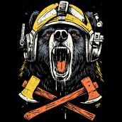This striking illustration features a grizzly bear rendered in a bold, graphic style. The bear is depicted with a fierce expression, its mouth open in a roar, revealing sharp teeth. Adding a touch of industrial flair, the bear wears a yellow hard hat and headphones, creating a unique juxtaposition of nature and machinery. Two crossed axes are positioned below the bear, further emphasizing the lumberjack theme. The color palette is limited to black, yellow, orange, and gray, giving the design a vintage, slightly distressed look. The overall effect is both powerful and eye-catching, making it suitable for a variety of applications.