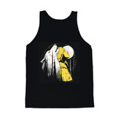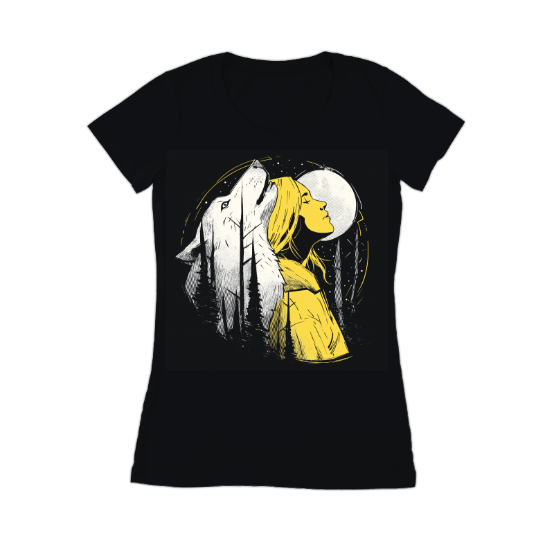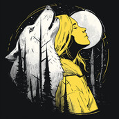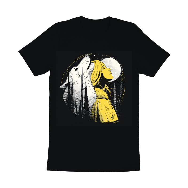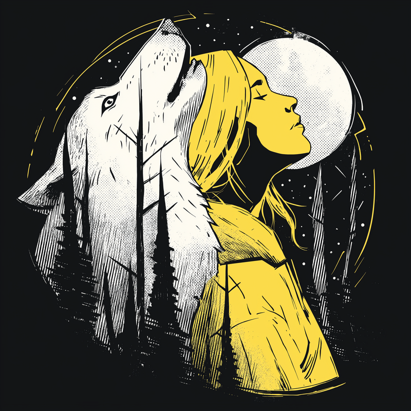 This captivating design features a striking juxtaposition of elements, creating a harmonious yet powerful visual. On one side, a majestic wolf howls at the moon, its form merging seamlessly with a dense forest of pine trees. The wolf and forest are rendered in a detailed, cross-hatched style, using black and white to create depth and texture. On the other side, a woman stands in profile, her face tilted towards the sky, bathed in the moon's glow. Her form is depicted in a contrasting yellow hue, providing a vibrant counterpoint to the monochrome wolf. The background features a full moon and a scattering of stars, adding to the design's mystical and ethereal quality. The overall composition is balanced and visually engaging, making it suitable for a variety of applications.