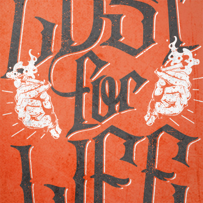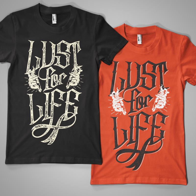 "Lust For Life" T-shirt design featuring typography style quote, with distressed details. The files available are suitable for Adobe Illustrator and Adobe Photoshop and can be used for digital printing and screenprinting.