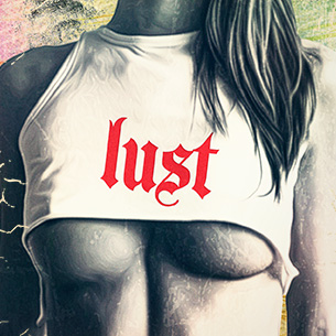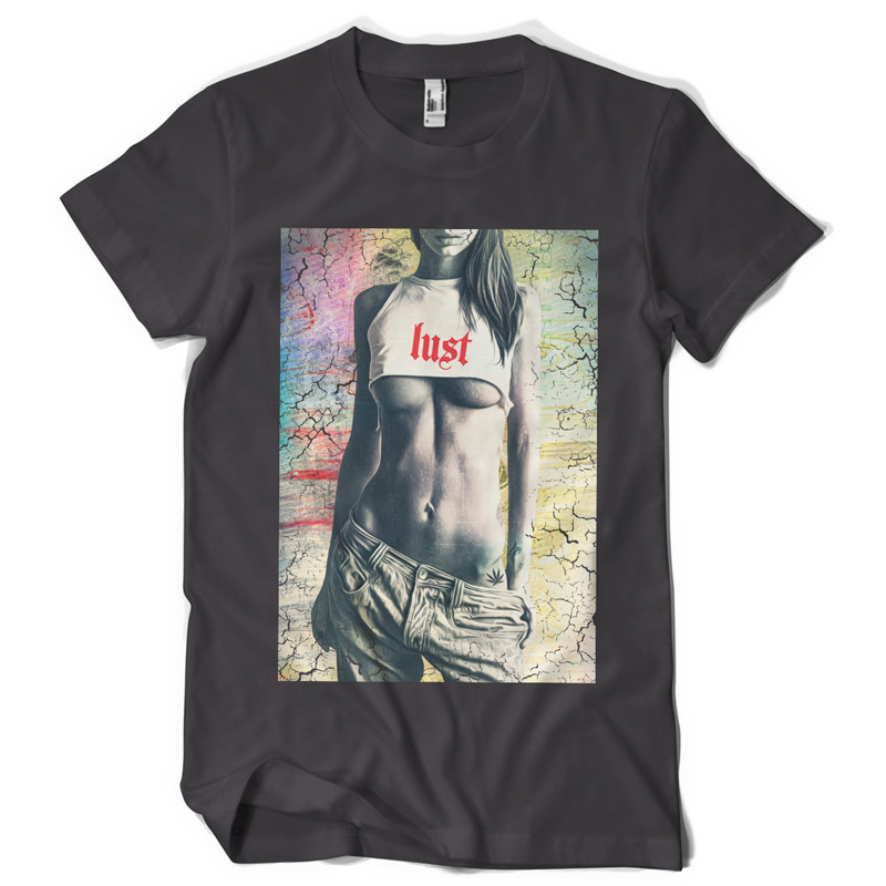 "lust" Artwork created in Adobe Photoshop. The file available for the client upon purchase and download are 1 layered file in TIFF (with transparency) format designed for DIRECT TO GARMENT printing. Also available upon request is 1 file in PDF format, layered, designed for the SCREEN PRINTING.